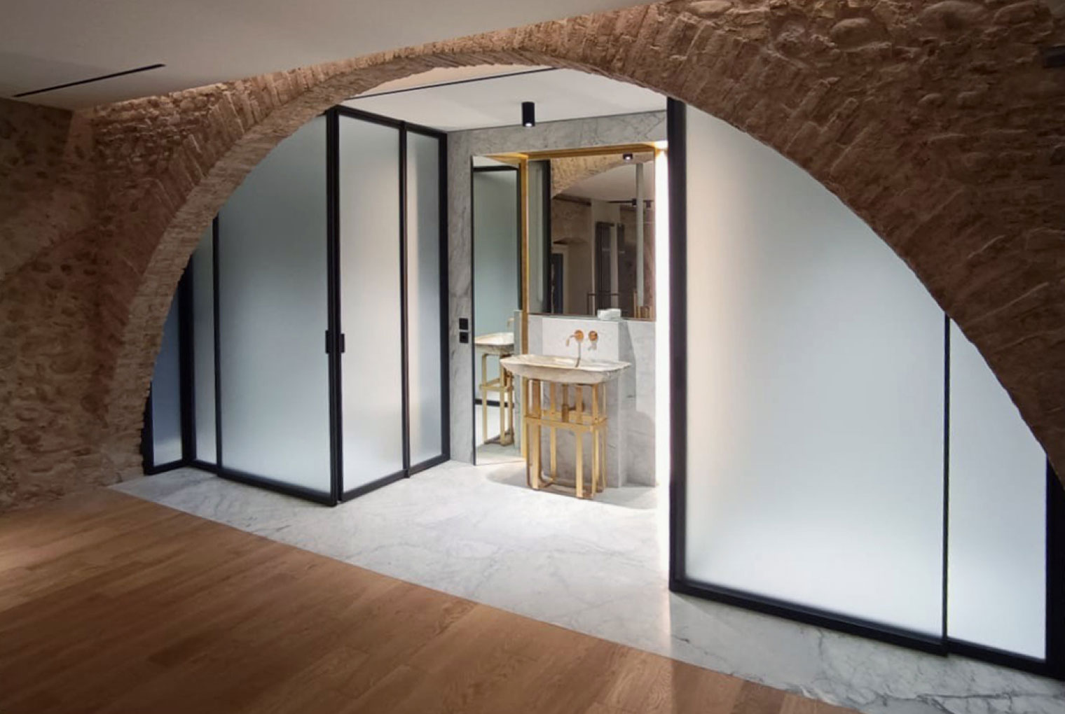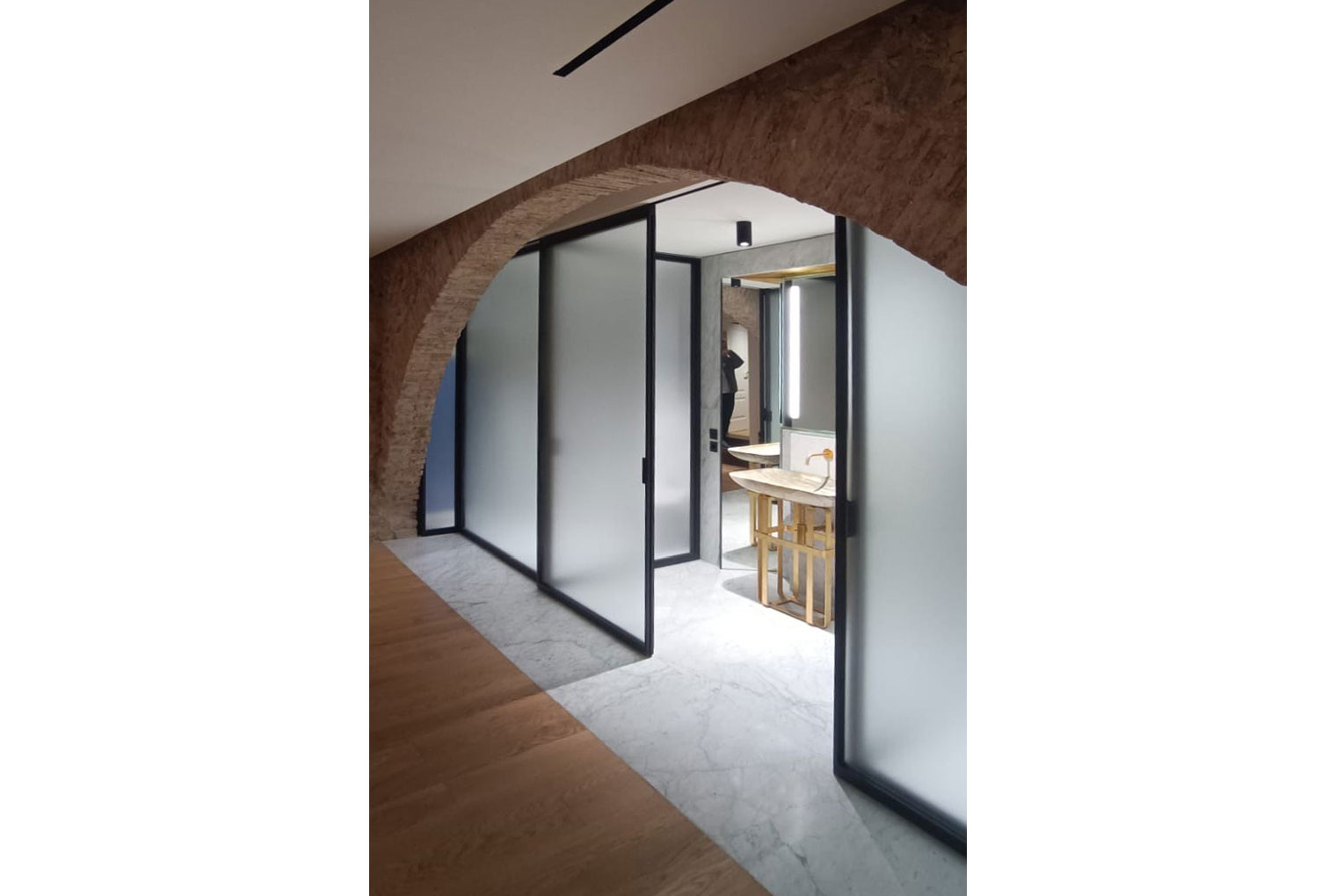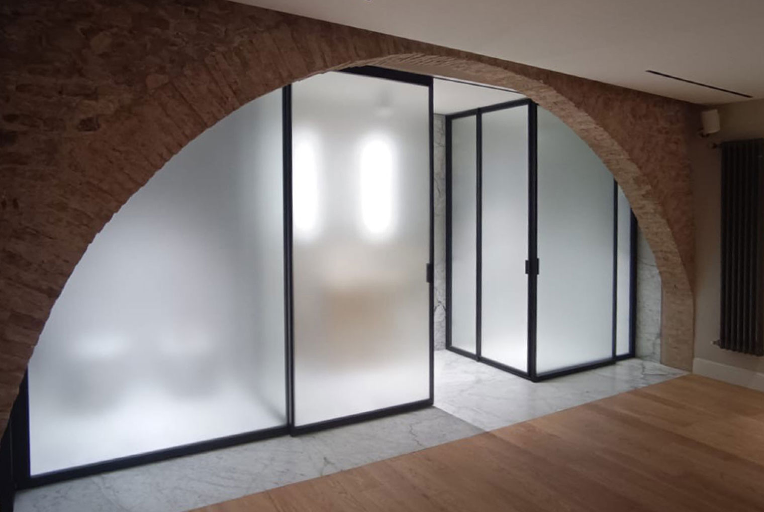 For this project, the Suite collection proved to be the ideal choice: the sophisticated Metal gun-finish profiles harmonize the classical structure of the spaces with a touch of modernity, while the 36 Riga 1.5 Satin Extra-Clear glass gently diffuses natural light, creating a balanced interplay of privacy, comfort, and elegance.