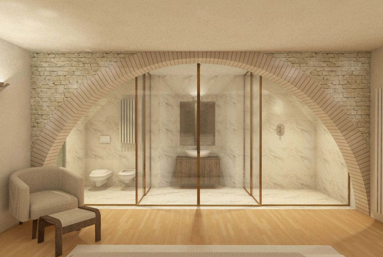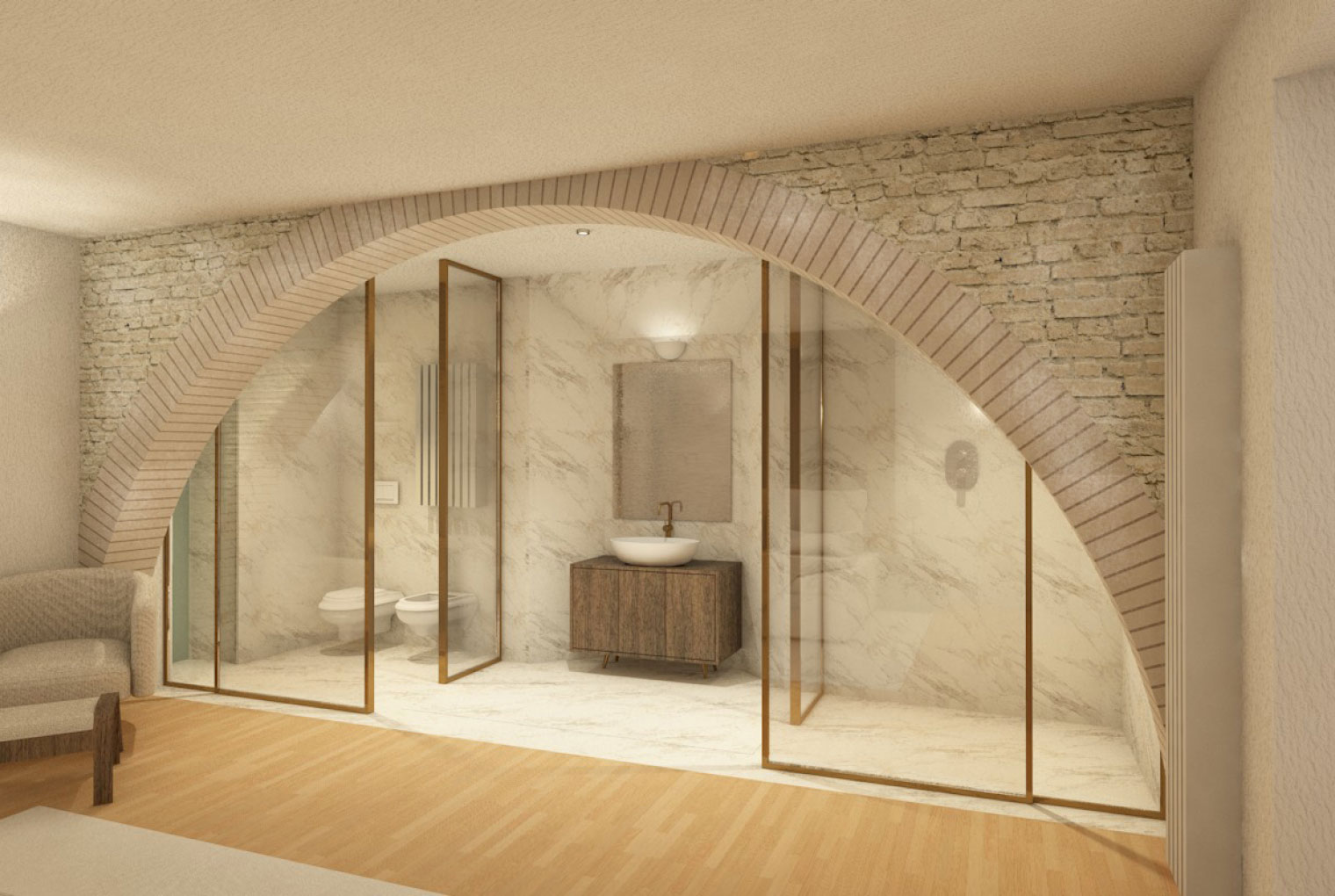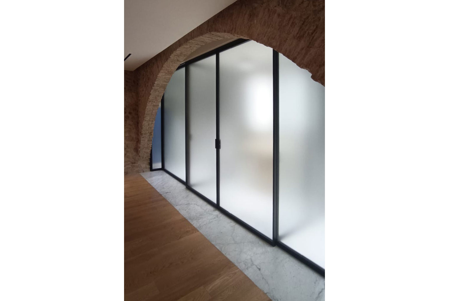 For this project, the Suite collection proved to be the ideal choice: the sophisticated Metal gun-finish profiles harmonize the classical structure of the spaces with a touch of modernity, while the 36 Riga 1.5 Satin Extra-Clear glass gently diffuses natural light, creating a balanced interplay of privacy, comfort, and elegance.