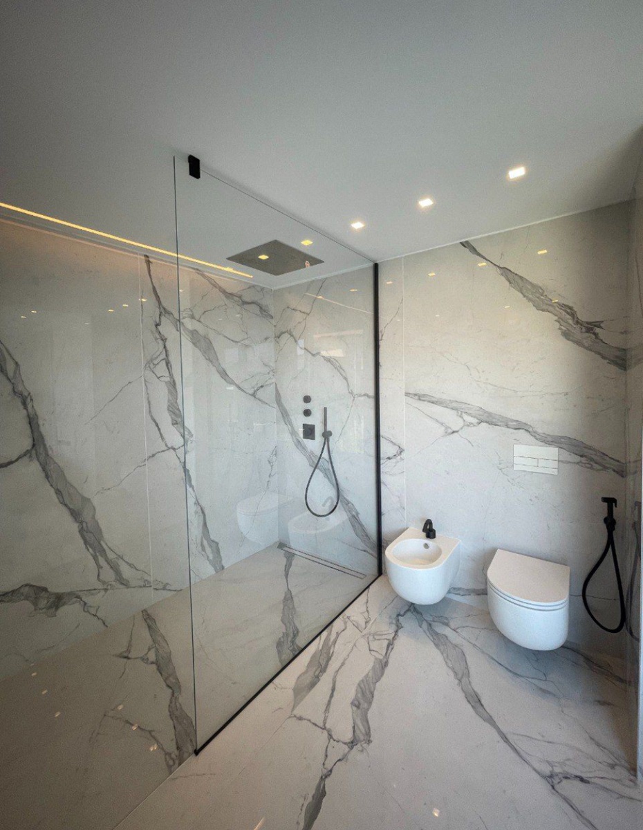 La parete doccia walk-in modello SK-M della collezione Sk-In in versione MOPA con morsetto a plafone definisce lo spazio con rigore ed essenzialità, interpretando l’ambiente bagno come un luogo di benessere e design.