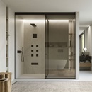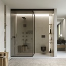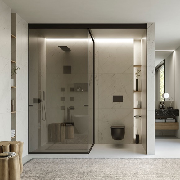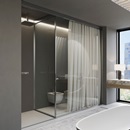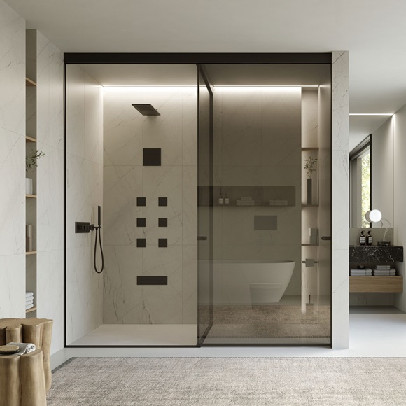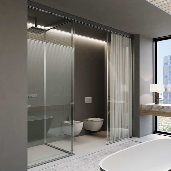 Nato come ricerca e maturato nella pratica, Voile traduce l’intuizione in metodo operativo: la vetrata scorrevole a tutt’altezza diventa una grammatica sobria e rigorosa; il vetro si fa tessuto di luce; i profili, segni discreti, scandiscono i percorsi. Il sistema corre fino a soffitto, si adatta al centimetro e garantisce la tenuta all’acqua in area doccia grazie a una sottile soglia; trasparenze e pannelli coprenti permettono di dosare la privacy senza interrompere la continuità visiva.